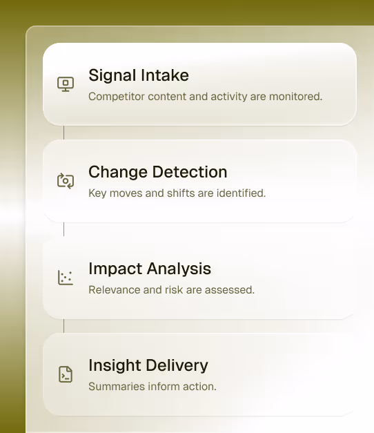 Teams react late to competitor launches, pricing changes, and campaign shifts due to manual monitoring.